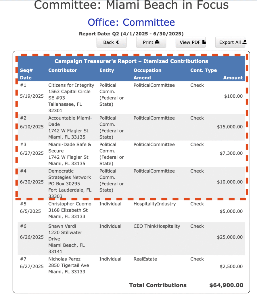 Above: Ehrlich’s Miami Beach in Focus has received donation from four separate Political Committees, making it difficult to know the true source of the funds